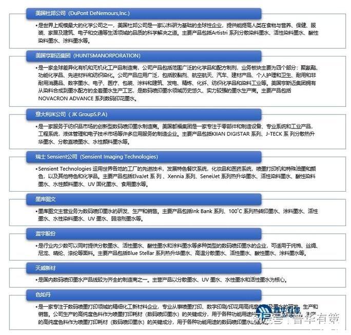 數碼噴印墨水市場呈現與數碼印花設備市場相近的市場競爭格局,由海外巨頭主導市場,如美國杜邦公司、美國亨斯邁集團、意大利JK公司等。從全球范圍來看,目前歐洲、北美地區的數碼噴印技術仍處于較高水平,是率先對數碼噴墨印花技術實現產業化的地區,受益于較高的環保標準和豐富的時尚原創設計產業,歐洲、北美地區的數碼印花產品供需旺盛,數碼噴印應用產業規模大且普及程度高,全球領先的數碼噴印墨水制造商多集中于此,亞太地區則以日本、韓國制造商為主。我國的數碼噴印墨水行業起步較晚,企業規模、研發能力以及產品穩定性等方面參差不齊,且主要以中小型企業為主,但隨著最近幾年國產數碼噴印墨水的快速發展,我國也出現了少數綜合實力相對較強的專業生產商。國內外主要墨水生產商情況如下: