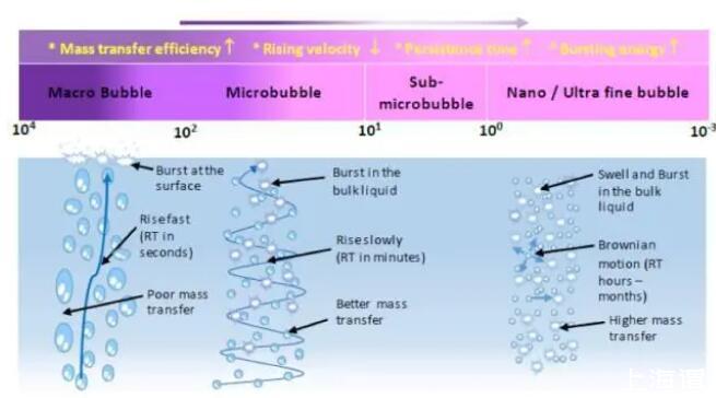 氣泡表面積和氣泡直徑呈負相關關系,(表面積A和直徑D的數(shù)學關系A=6/D)。因此同樣體積的氣泡,100納米直徑氣泡表面積是10微米直徑面積的100倍。