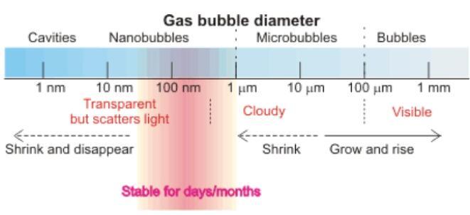 氣泡分類不僅根據(jù)大小,而且根據(jù)其特征和在液體中的行為。圖1對不同氣泡大小的分類進行了匯總。1-10微米氣泡其大小和特征都介于微米氣泡和納米氣泡之間,被歸類到亞微米氣泡。雖然學術界對微米氣泡的特征有一致看法,但是對氣泡的大小范圍沒有統(tǒng)一標準。