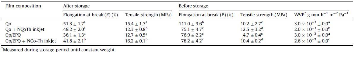 在儲(chǔ)存前后測(cè)量了印有4層NQoThs的薄膜的機(jī)械性能和WVP,這些結(jié)果如表4所示。