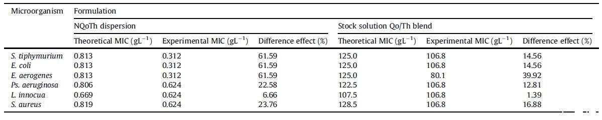 本研究的一個(gè)目標(biāo)是確定對(duì)微生物的影響是否是由于組分的協(xié)同或相加作用。通過(guò)根據(jù)NQoThs中存在的百分比(QoLMW為75%,Th為25%)對(duì)QoLMW和Th的MIC進(jìn)行加權(quán),將NQoThs的MIC與附加效應(yīng)的估計(jì)值進(jìn)行比較。NPs(NQoTh)和QoLMW/Th原液的MIC值均低于基于組分加和效應(yīng)估計(jì)的MIC,表明Qo和Th之間存在協(xié)同效應(yīng)(見(jiàn)表5)。然而,取決于測(cè)試的細(xì)菌,NPs的MIC比庫(kù)存QoLMW/Th混合物低大約1.5到4.5倍。Wazed Ali、Rajendran和Joshi(2011)評(píng)估了使用TPP從440-kDa Qo的1.0%(w/v)溶液中產(chǎn)生的NQo(115.5 nm)的AM抗金黃色葡萄球菌。NQo比Qo原液更有效地抑制這些細(xì)菌的生長(zhǎng)50%。