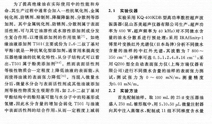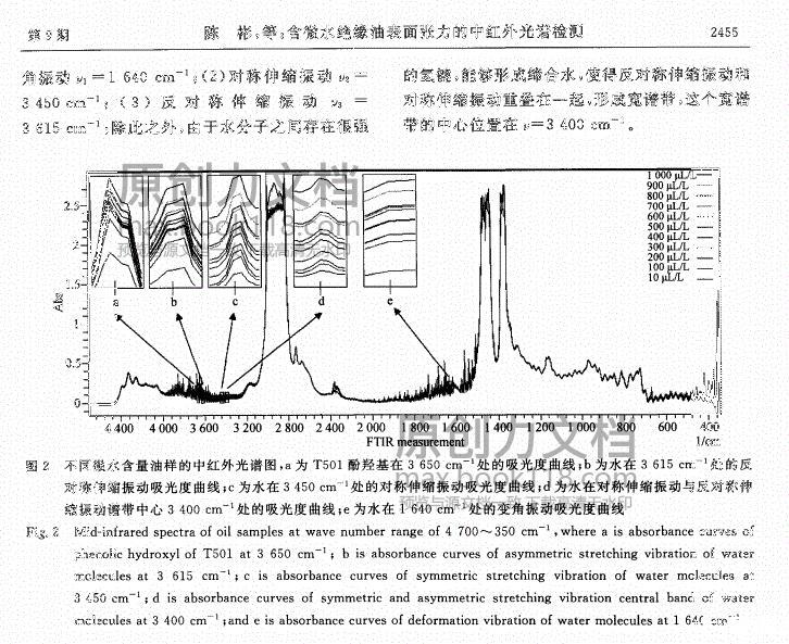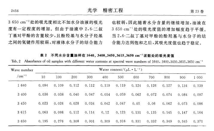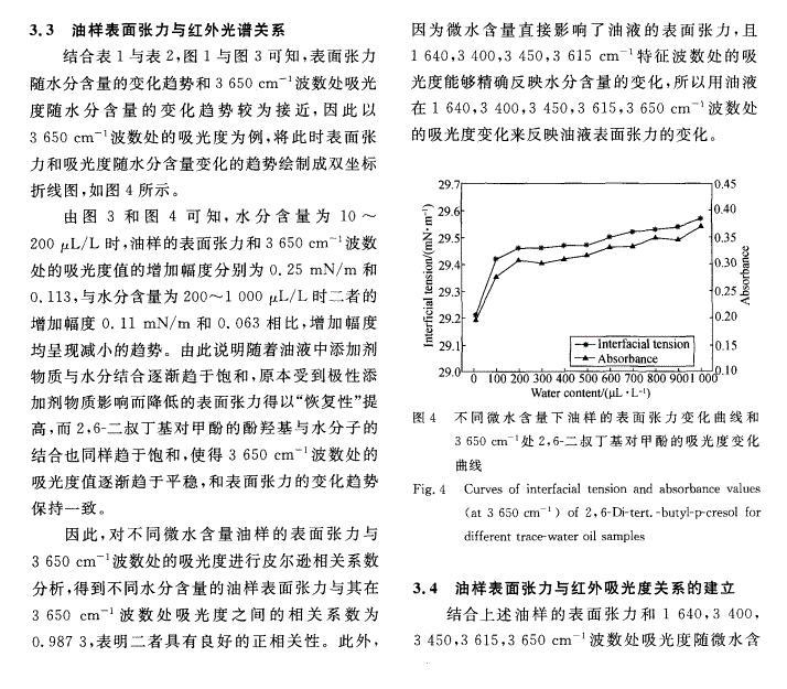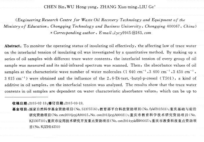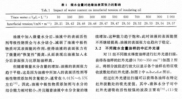 【摘要】:為了有效監控絕緣油的運行狀態,采用定量分析方法探討了微量水分對絕緣油表面張力的影響規律。通過配制不同微水含量的絕緣油樣,對每組油樣進行表面張力測試,然后對油樣進行紅外光譜掃描,獲取了油樣中水分在特征波數處(1 640,3 400,3 450,3 615cm-1)的吸光度值。分析了油液中2,6-二叔丁基對甲酚(T501)等添加劑對油樣表面張力變化規律的影響。結果表明:油樣中水分含量與水分特征吸光度值之間有較好的相關性(相關系數分別為0.964 1,0.984 8,0.984 5,0.944 0),油樣表面張力和1 640,3 400,3 450,3 615,3 650cm-1波數處油樣吸光度值的變化亦均呈現良好的正相關性。建立了油樣表面張力與特征波數處油樣吸光度值的多元線性回歸模型,擬合精度為0.992 8;根據模型得到的表面張力計算值與實際測量值誤差為-0.07~0.06%,吻合性較好。文中的實驗可為含微水絕緣油的表面張力檢測提供理論支撐。