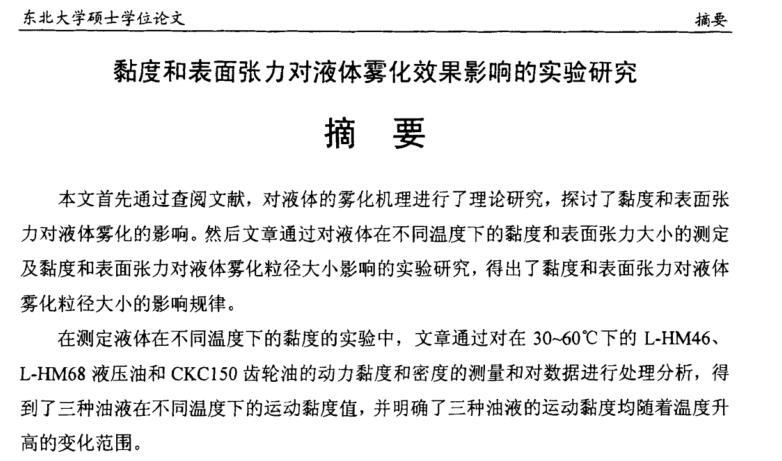 【摘要】:本文首先通過查閱文獻,對液體的霧化機理進行了理論研究,探討了黏度和表面張力對液體霧化的影響。然后文章通過對液體在不同溫度下的黏度和表面張力大小的測定及黏度和表面張力對液體霧化粒徑大小影響的實驗研究,得出了黏度和表面張力對液體霧化粒徑大小的影響規律。