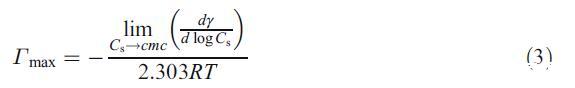 NP 溶液在不同 hp-β-CD 濃度下的界面張力(γ)如圖 1 所示。在任何 hp-β-CD 濃度下,界面張力隨著 NP 的增加而降低。 Hp-β-CD 由七個葡萄糖單元組成,形成一個具有親水外表面和疏水內腔的環,眾所周知,它主要以 1:1 的化學計量將客體分子結合到疏水腔中 [11]。 在 hp-β-CD 的水溶液中,NP 被認為結合了 hp-β-CD 的疏水腔。 眾所周知,Hp-β-CD 由于其親水性外表面而不吸附在空氣-溶液界面。 這表明未摻入 hp-β-CD 腔的 NP 分子吸附在空氣 - 溶液界面。 在任何 hp-β-CD 濃度下均未觀察到表明膠束化開始的斷點(即臨界膠束濃度 (cmc))。 由于 NP 非常疏水,體相中的 NP 單體濃度不能增加到 cmc。 根據 γ 與 log CS,非離子 NP 的最大表面過量 (Γmax) 通過 Gibb 吸附方程估計如下 [12]: