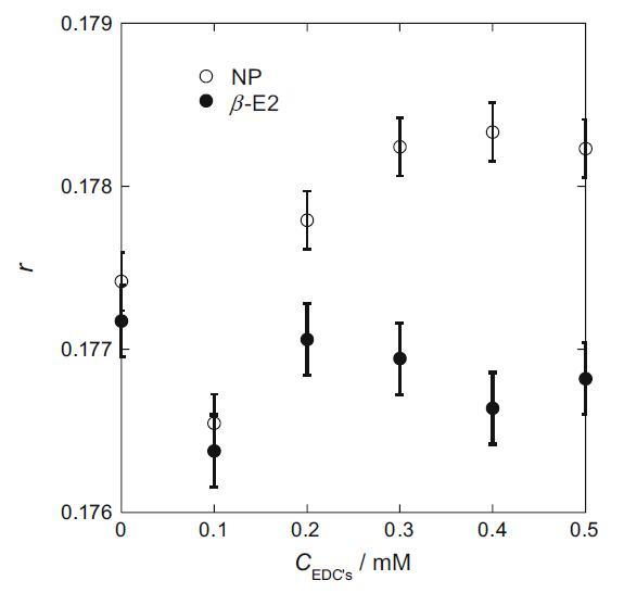 RB 分子在膠束表面區域溶解得越硬,r 值越大[15]。 r 值的變化如圖 3 所示。在 0.1 mM 時,r 值下降。 這表明 EDCs 開始溶解到膠束中擾亂了 RB 分子在膠束表面的緊密堆積。 隨著NP濃度的增加,r值增加。 然而,隨著β-E2濃度的增加,r值一度恢復并似乎一點點下降。 這表明 NP 的增溶使膠束表面更加剛性,而 β-E2 的增溶則沒有。 NP在結構上更類似于HTA+。 因此,NP在膠束中的HTA+離子頭之間增溶,降低了膠束表面離子頭的靜電斥力,使膠束更加穩定和剛性[16]。 另一方面,β-E2 似乎會干擾 HTA+ 的取向并降低膠束表面的剛度。