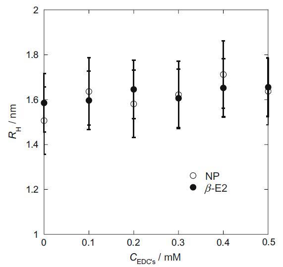 我們在每個 EDC 存在下通過動態光散射方法研究了 HTA+ 膠束的 RH(圖 4)[17]。 隨著 EDCs 濃度的增加,膠束的流體動力學半徑似乎逐漸增加。