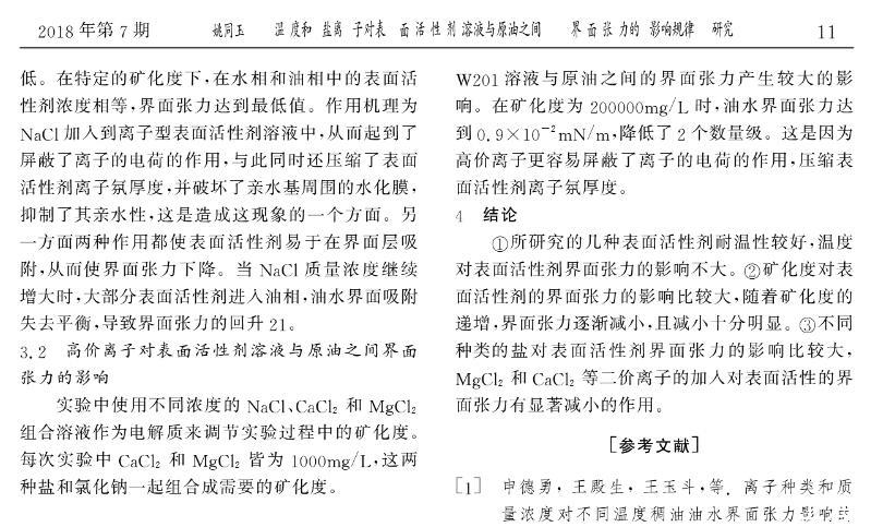 溫度和鹽離子對表面活性劑溶液與原油之間界面張力的影響規(guī)律研究