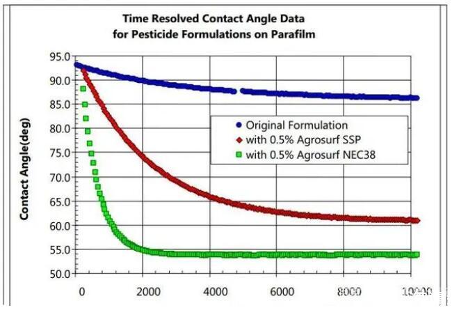 農(nóng)藥在低于表面活性劑臨界膠束濃度(CMC)的情況下,濃度越高,潤(rùn)濕性越好,達(dá)到臨界膠束濃度后,才可能不因氣液界面的擴(kuò)大而增大農(nóng)藥的表面張力,使農(nóng)藥在葉片上更好的潤(rùn)濕和鋪展。例如用DSA25接觸角測(cè)試儀測(cè)試水稻的表面能介于30-36mN/m之間,農(nóng)藥經(jīng)水稀釋后,藥液內(nèi)的表面活性劑濃度應(yīng)大于濃度臨界膠束濃度(可用K100表面張力儀測(cè)試得到CMC),且表面張力小于水稻的表面能,才能使得藥液在葉片上潤(rùn)濕鋪展,提高農(nóng)藥利用率。
