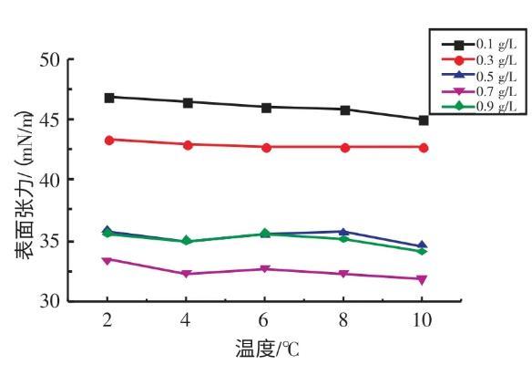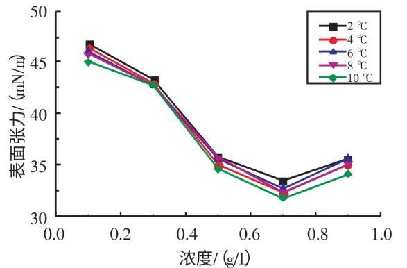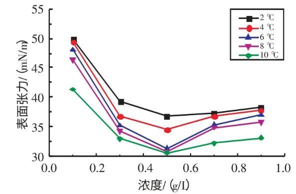 2.2.1不同溫度下十二烷基苯磺酸鈉溶液表面張力與濃度的關(guān)系實驗研究了在溫度為2、4、6、8、10℃條件下,SDBS溶液的表面張力與濃度的關(guān)系(見圖3)。由圖3可知,當(dāng)濃度在0.1~0.7 g/L時,隨著SDBS溶液濃度的升高,其表面張力逐漸減小;當(dāng)濃度在0.7~0.9 g/L時,隨著SDBS溶液濃度的升高,其表面張力逐漸增大。當(dāng)SDBS溶液濃度為0.7 g/L時,其表面張力取得最小值。