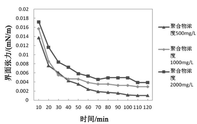 在石油磺酸鹽濃度為0.1%,模擬污水礦化度4200 mg/L,碳酸鈉濃度0.6%條件下,分別測定聚丙烯酰胺濃度為500、1000和2000 mg/L的復(fù)合體系隨時(shí)間變化的界面張力值,結(jié)果如圖2所示。
