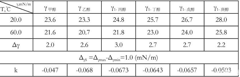 表1醇類在不同溫度下的表面張力