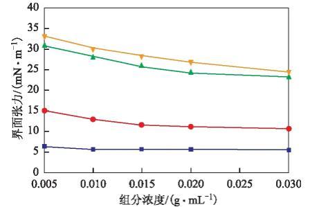 在模擬油中溶質濃度為0.020 g/mL時,以不同濃度的氯化鈉水溶液作為水相,考察水相鹽濃度對380號燃料油及其四組分模擬油的油水界面張力的影響,結果見圖4。從圖4可以看出,隨著水相鹽濃度的增加,除飽和分的油水界面張力略有下降外,其它組分和燃料油的油水界面張力變化不大。白金美[12]的研究結果表明,水相鹽濃度對遼河和孤島稠油及其瀝青質、膠質的油水界面張力影響不大。這與本實驗結果相似,但遼河和孤島稠油及其組分模擬油的油水界面張力均大于380號燃料油及其對應組分模擬油的油水界面張力,表明后者的界面活性強于前者。